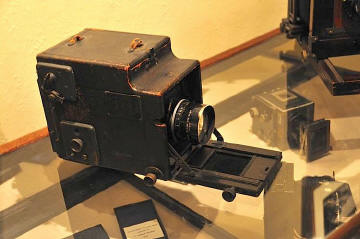 The studio room is a large double fronted room at the front of the property. It is laid out as a photographic portrait studio with black curtains on the windows pulled to allow you to see it as it would have been if you were having your photo taken. The area by the windows has on display the main camera, a very large plate camera with extending bellows on a wooden frame that can be height adjusted, used for taking portraits, various different lighting arrangements. Along the opposite wall is the area where the portrait clients would have sat or stood, there is a background hanging on the wall and in front a raised platform arrangement with chair and different cloths used in setting up the photo, there are also props including those for keeping children amused. Being a Georgian building the room was very large and had high ceilings so ideally suited as a photo studio.