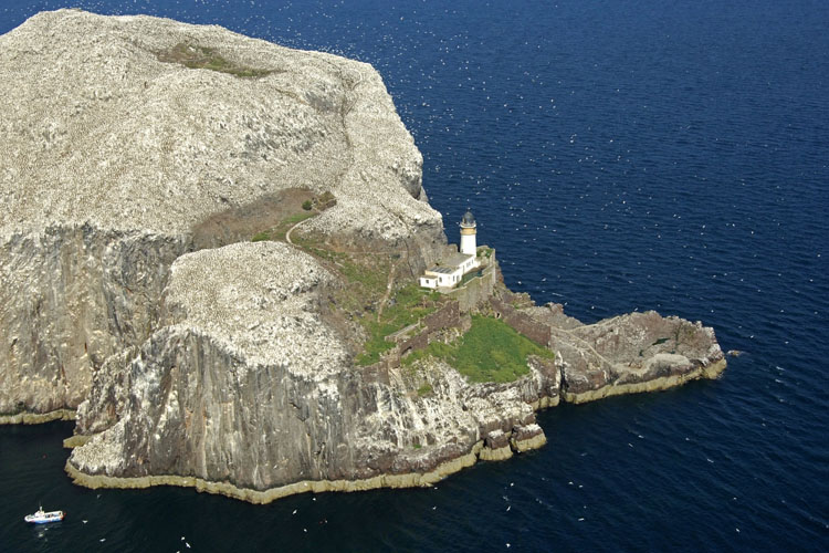 Bass Rock is located about 3 miles north east of North Berwick, and is a steep crag on the southern entrance to the Firth of Forth, rising about 350ft above the sea. It is an important nesting ground for seabirds, especially gannets. Bass Rock is about a mile in circumference. Through the Rock, from the East to West, runs a natural tunnel, but this is not accessible except at low tide. Half way up the rock stands the ruins of a pre-reformation chapel which was consecrated in 1542. It has a long and varied history and is mentioned in writings dating back to around 1316. In 1671 Charles I claimed it as Royal property and later the fortress/castle was turned into a prison, by 1700 however after a number of attempts to claim it by others the fortress was demolished. In 1706 it was sold to Sir Hugh Dalrymple and his descendants still own it today. From 1706 up to the 1st World War it continued to be let out to tenants who earned money by fishing, grazing sheep and making use of the seabirds. The lighthouse was established in 1901 and is still active today. It was build by David Stevenson, who demolished a 13th century keep, or governors house and some other buildings within the castle to be able to use the stone to build it. It was automated and demanned in 1988 and is now remotely monitored from Edinburgh. Today the true residents of the island are the