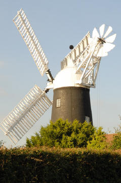 Hewitts WindmillHeapham, Lincolnshire Clicking on either of the images above shows a larger version Hewitts windmill is a renovated Tower mill with sails (non working). It was built by the millwright Johnson of Low Burnham near Haxey in 1876 to replace a post mill. It worked until around 1950 when it was struck by lightning and damaged. Mr Hewitt, the owner, repaired the mill and set it to work once more, being awarded an S.P.A.B. 'Windmill Certificate' in recognition of his efforts in 1952. Lightning struck again in 1956, wrecking the mill by breaking the iron winds shaft in two, dumping the sails on the ground and smashing them to pieces. The damage was too great to repair and the mill was abandoned. Some of the parts (two pairs of stones, their fittings and gear) was taken out and put into Heage mill in Derbyshire when that mill was being renovated in 1973. When we visited we found a mill that could be photographed from the road, it is located at the back of a small farm yard. From any other direction the lower part of the mill is hidden from view by buildings. The view you get is therefore very dependent on the direction it is pointing at on the day you visit. Two of our images is shown above. We didn't go around the fields behind, but as you can see below there is a pleasing view, although the bottom of the mill is hidden.