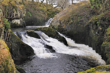 Geography and a bit of history Ingleton's postal address is Lancashire and sits on the boundary of Lancashire and North Yorkshire. The Waterfalls Trail is just in the Yorkshire Dales National Park. Ingleton sees the meeting of two rivers the River Twiss and the River Doe to form the River Greta which flows under the viaduct and beyond. Both rivers travel through densely wooded gorges on their way down and within these lies England's greatest concentration of waterfalls. Ingleton has been known for its other attractions, the caves etc since the end of the 18th Century, but the falls were hidden from view and people were not aware of their existence. Then the Lancaster Guardian, amongst others, ran articles on the scenery and surrounding area and this generated a lot of public interest. So much so that an 'Improvement Company' was formed and pathways and wooden bridges were built to allow better access and it has remained a tourist attraction since Good Friday, 11th April 1885 when it first opened to the public. The Waterfall Trail The Ingleton Waterfalls Trail is a circular 4.5 mile walk which takes you from the centre of Ingleton up the side of the River Twiss across the hills and back to Ingelton alongside the River Doe. It is owned and managed by the Ingleton Scenery Company who provide a car park within Ingleton at the start of the walk, also in the Car Park area are toilets and a cafe. You will need 2.5 to 4 hours to complete the full route and the trail follows a well-defined footpath over inclined ground, where a climb is necessary steps are provided. In total the number of steps provided at different points over the whole of the trail is 1,000. It is open 7 days a week from 9am until dusk, and our winter visit in January 2009 the gates to the car park were closed at around 2pm. It is not a route for the infirm, featuring a number of steep, narrow and rocky sections, as well as protruding tree routes and uneven ground. The trail takes you through ancient oak woodland and impressive scenery and along the way you get to see some spectacular waterfalls and geological features. The woodlands contain oak, ash, hazel and wych elm trees as well as yew trees on the cliffs and scars. Ground flora include dogs mercury, wild garlic, tufted hair grass, great wood-rush and bilberry, there is also a lot of woodland mosses, such as Yorkshire feather moss, liverworts and an enclosure with reintroduced lady's slipper orchid. Around the waterfalls you may see, at certain times of the year, a variety of birds, Brown Trout leaping and dippers may be seen at water level, and probably other wildlife besides. You need to be prepared for this walk, make sure you are wearing suitable footwear, such as walking boots, Wellington boots or substantial shoes, have clothing suitable for weather changes and plenty of water to drink. A hiking pole or substantial monopod would also help in getting over some parts. Many visitors also take small packed lunches to eat on the way round, there are a number of resting areas. It's usual to tackle the route clockwise, walking north along the Twiss and then south along the Doe. Being a circular walk you could walk it from either end, but the majority of visitors start at the Broadwood Car Park. Starting from the car park you start the walk alongside the River Twiss, which has Swilla Glen, Thornton Glen, Pecca Falls, Holybush Spout and Thornton Force. Then following the path across fields and hills you reach the valley of the River Doe which has Beezley Falls, Rival Falls, Baxenghyll Gorge, Snow Falls, and Twistleton Glen. In all 8 waterfalls or groups of waterfalls. Each one an impressive sight and each one different in character, size and spectacle. Although usual to tackle the route clockwise from the car park, walking north along the Twiss and then south along the Doe. You could do the River Doe part of the walk first, as you can enter from the village and work your way backwards, paying at the end or after reaching Beezley Falls, turn around and walk back the same way you came. But you would have to try to remember afterwards to go to the normal entry point so as to pay the entrance fee. The backward way around may also be an option you would like to take so as to make an earlier start in the summer months before the car park and normal entrance is open. If you wanted to get to a particular waterfall you might find it quicker to get to it from the small Chapel le Dale road that is crossed when you cross from one valley to the other. We did our Waterfall Trail in January 2009 and although the trees were bare, it was winter, it was a nice fine day and not too cold. It would be good at some point to also do it in the summer, and again with autumn colours. In addition to this location guide for the walk we have location guides for the major waterfalls on it, and in this guide you will find links of to these guides and they each have the option to return you to the place in this guide that you left, so that you can continue your journey. This location guide takes the normal clockwise route. In addition to the images in this guide and on location pages for waterfalls we have 2 Galleries, one for each of the valleys. You will also find Ordnance Survey grid references and links that throw up in a new window, Multimap pages showing a labelled Ordnance Survey map. The Walk in Detail