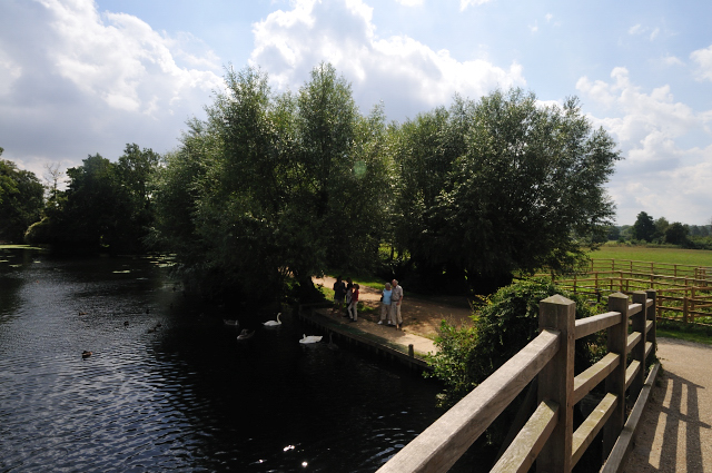Unfortunately you cannot see this view today as there are just too many trees. This is today's view from about the same position We go on to the bridge to get around the trees From the centre of the bridge looking down we can see where the mill stream breaks away from the lock. From nearer to this junction we can see the two channels. Moving down we get to the lock, and beyond the Lock we get the first real view of Flatford Mill, but we are now at a completely different angle.