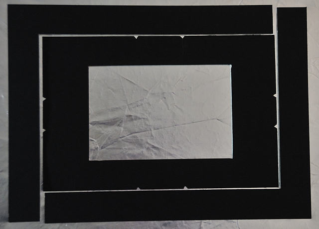 More recently I have created a set of frame cut outs, a set of these allows different view shapes, from square to long panoramas to be considered. In each of these cases, the objective is the same, to hold up a frame and by this means to be able to see what would, or could, be included within the picture. The artist's adjustable viewfinder in use Making Your Own Framing Aids We are going to look at how you can make TWO framing aids, from a piece of cardboard or mountboard and some elastic bands. You don't need a very large piece, so should be able to find something suitable at stationary shops, art outlets or from framing suppliers. In the example I am about to show you, I have used an off cut left out of the centre of a piece of mountboard when framing a photograph, but any piece that is A4 or larger will do. Mountboard is ideal as its quite strong, therefore the sizes of borders can be smaller than if you use a thin card. If you wanted you could use a side out of a cardboard box. The best coloured mountboard or card to use is either black or grey, as these are neutral and can better isolate the image without affecting the colours. Cutting out the two framing aids Out of this piece of card we want to cut:-
